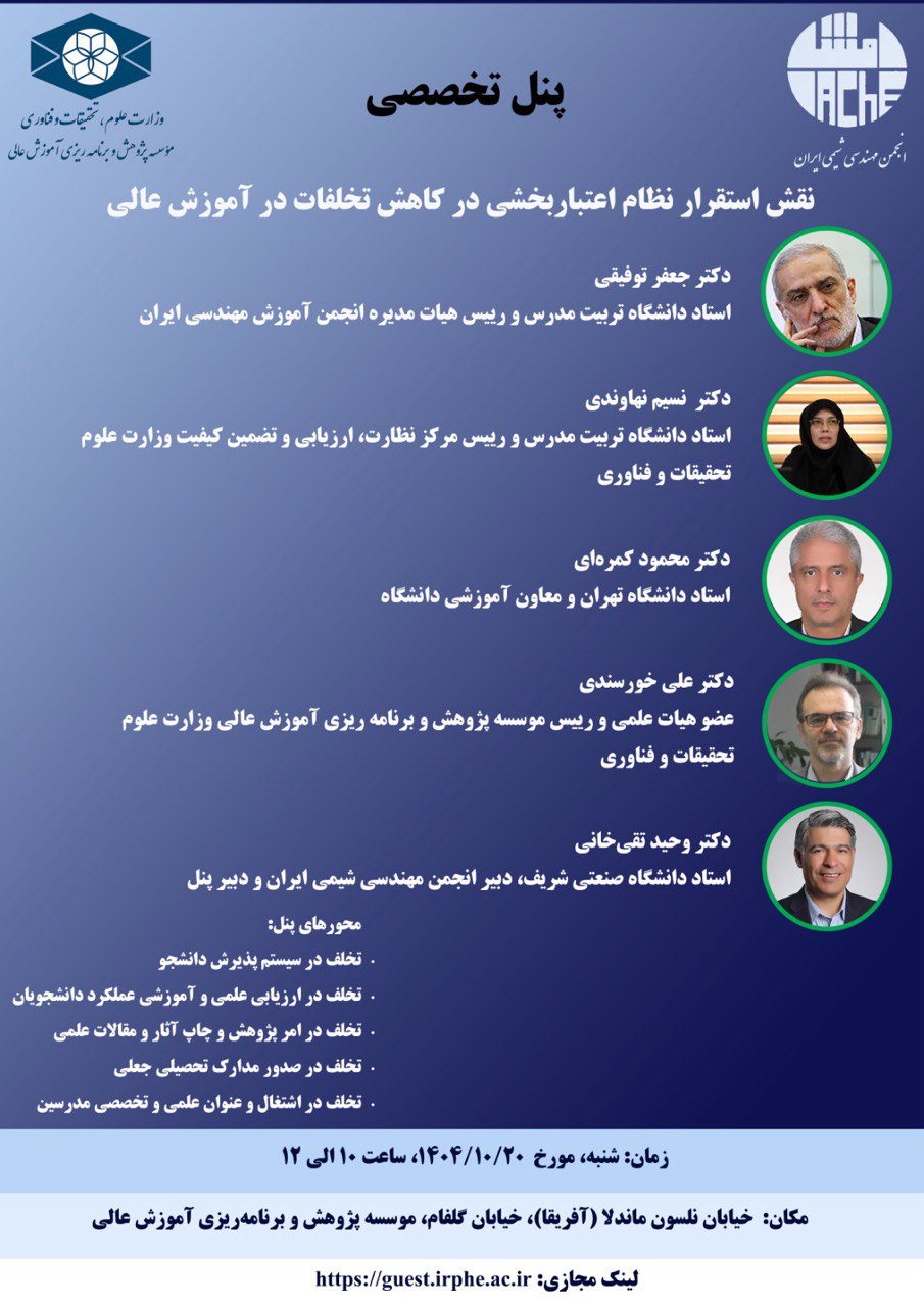 عنوان نشست علمی یکشنبه 14دیماه سالجاری : “کارگاه مبانی تحقیق علمی و پروپوزال نویسی”دسامبر 30, 2025حل مسائل کشور با ماموریت گرایی دانشگاهها، ایجاد شبکههای علمی و نگاه سیستمی ممکن استدسامبر 31, 2025 نمایش کامل پنل تخصصی با موضوع: نقش استقرار نظام اعتبار بخشی در کاهش تخلفات در آموزش عالی اشتراک0 خانم آزادی مطالب مرتبطدسامبر 31, 2025حل مسائل کشور با ماموریت گرایی دانشگاهها، ایجاد شبکههای علمی و نگاه سیستمی ممکن استادامه مطلب دیدگاه ها بسته شده است.